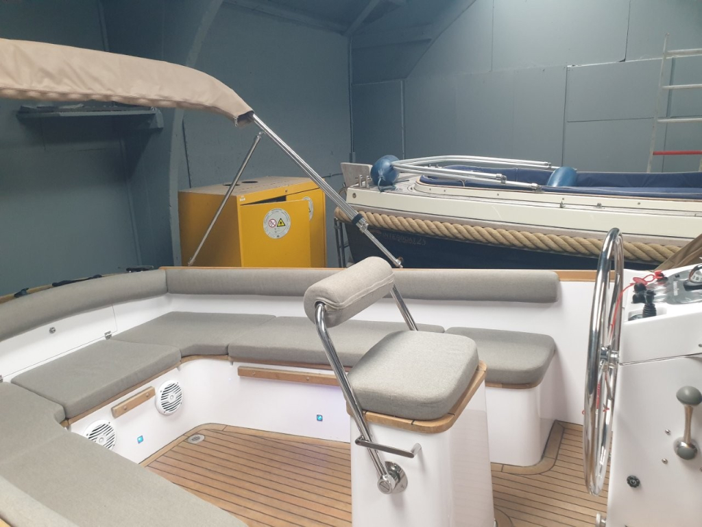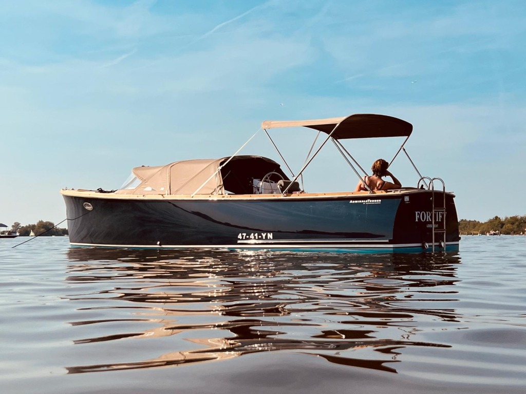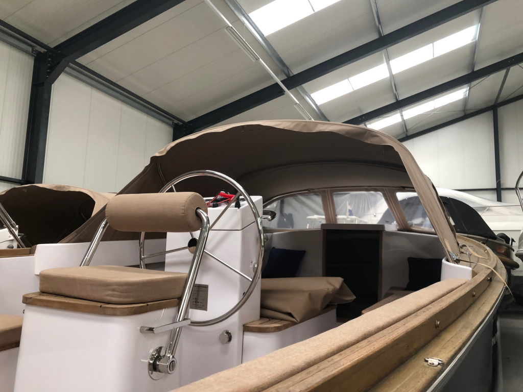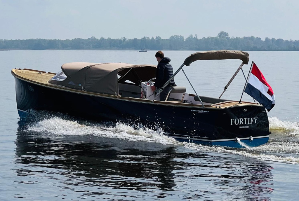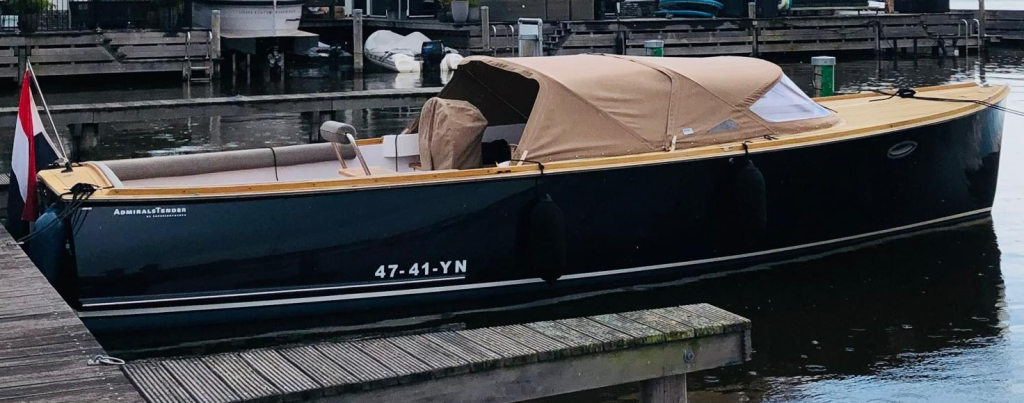 Deze prachtige AdmiralsTender Classic met donker blauwe romp en driedelige beige buiskap met afsluittent over gehele kuip (2019) is een stijlvolle en sportieve tender. De ruime kuip is voorzien van