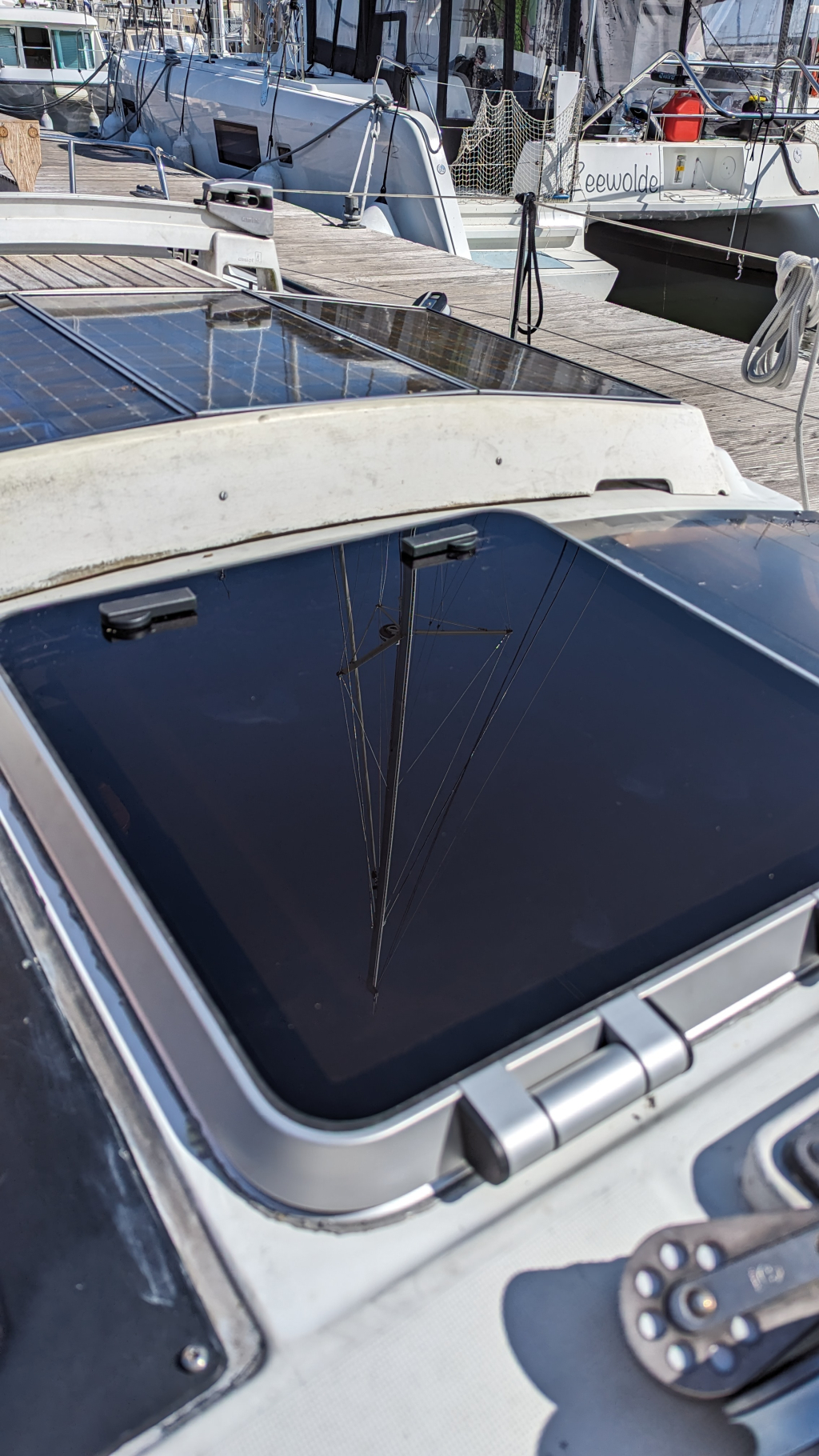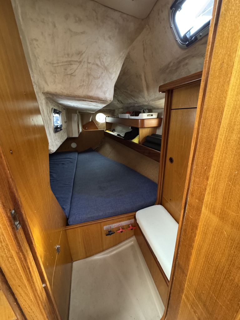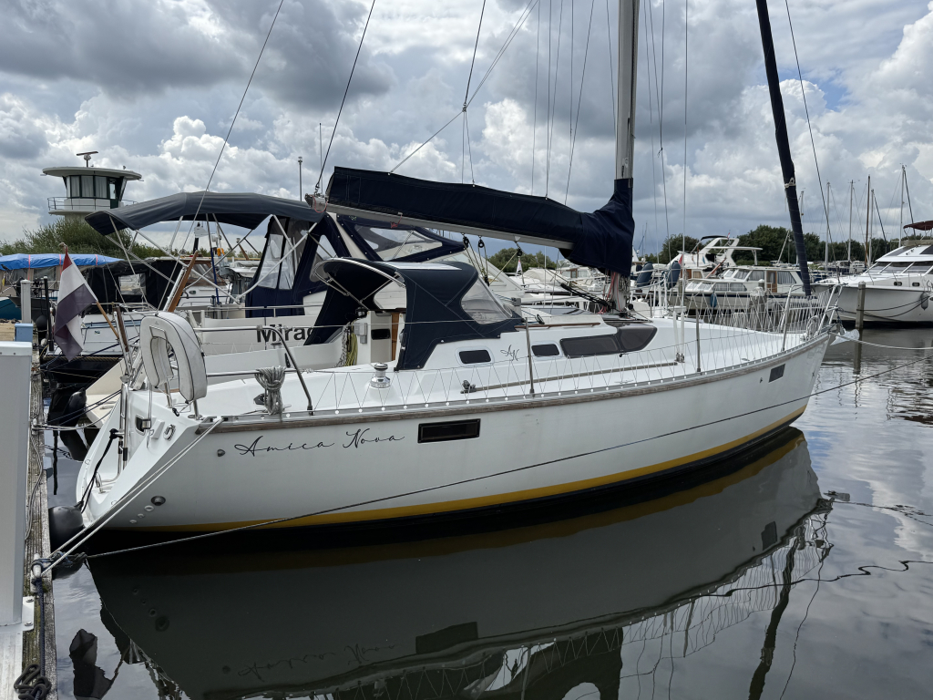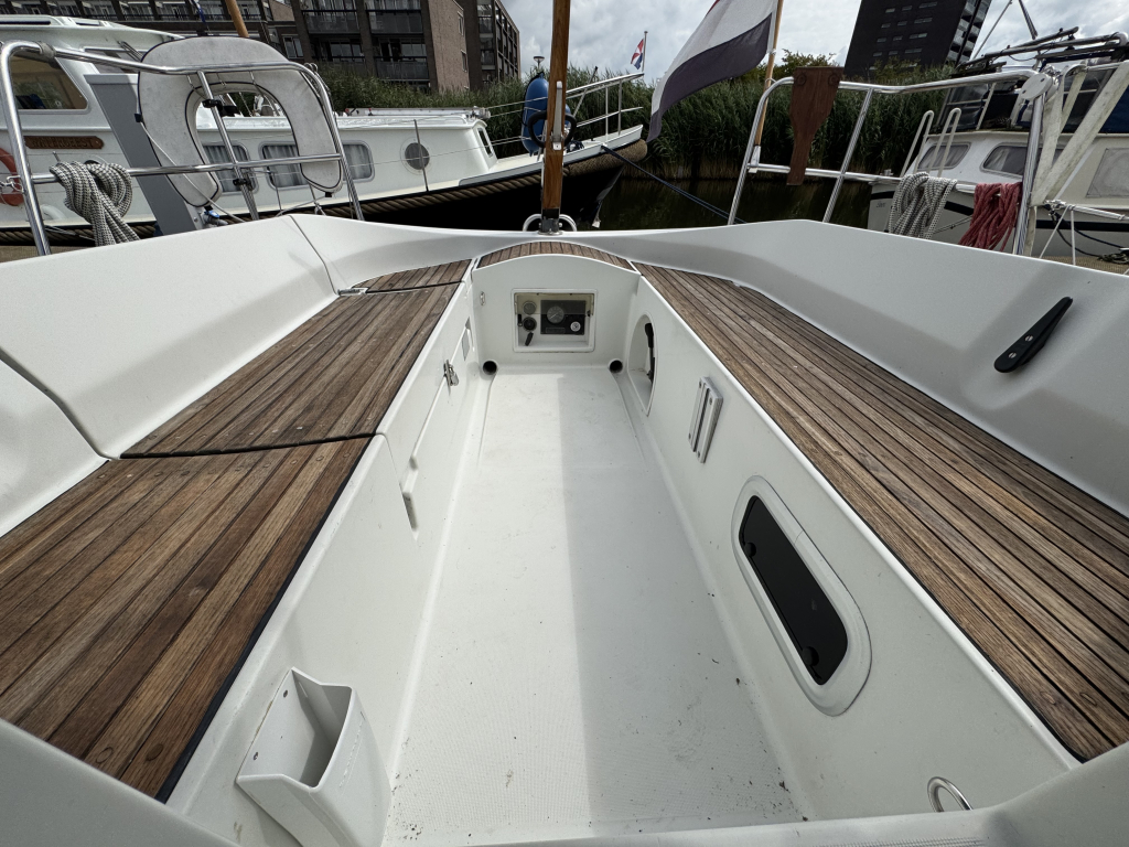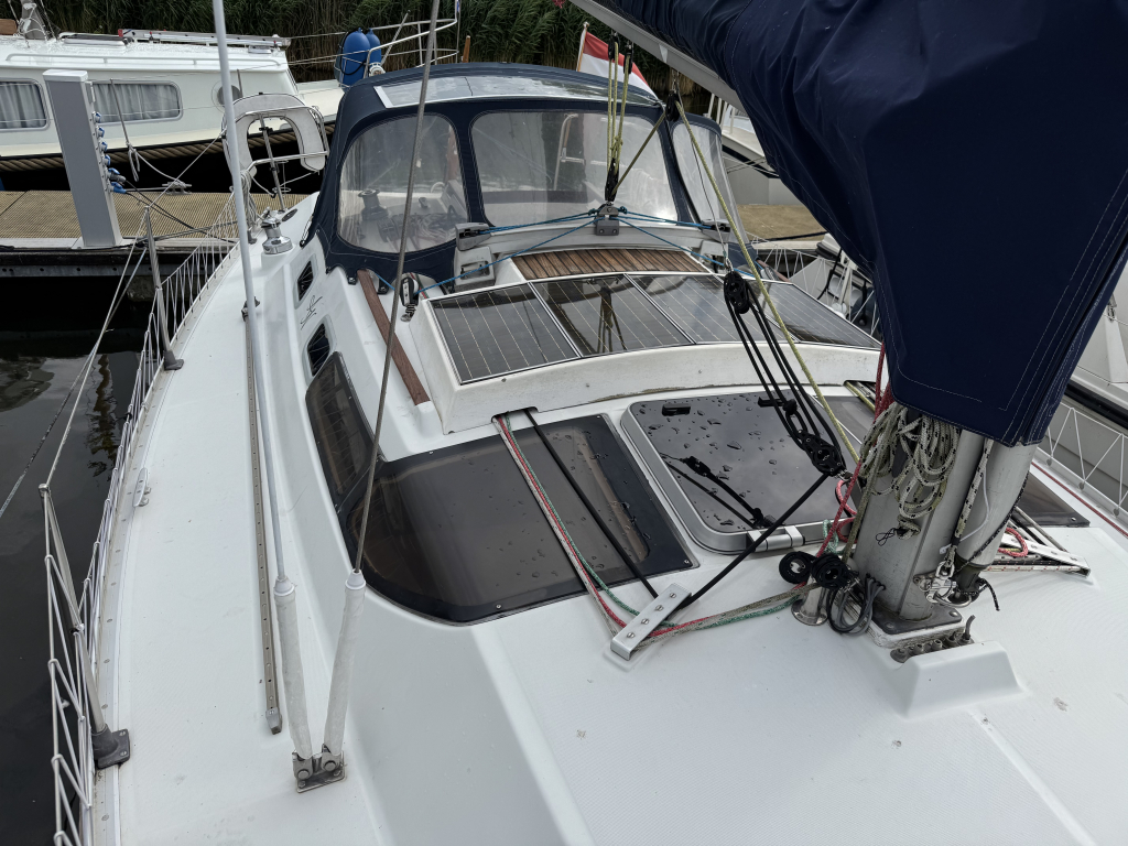 In 2021 is de mast ingekort i.v.m. 12.50 meter bruggen (Randmeer, Ketelmeer, Zeeland etc). Nieuwe verstaging en nieuwe vallen (2021). Elektra mast vervangen(2022) stoomlicht(LED), deklicht(LED), navigatieverlichting(LED) en marifoonkabel. spinnaker-boom. De aluminium mast is 20 cm ingekort aan de onderkant bij tuiger RS service (2021). Owners comment: "Zoals omschreven is de vernieuwde zeil-voering, ontworpen en uitgevoerd door een professionele Tuiger in Zwartsluis die zeer veel ervaring heeft met dit soort ingrepen op zeiljachten. Het zicht is beter geworden doordat het voorzeil hoger is gesneden. De giek komt tot en met de buiskap, dat maakt dat de kuip nog altijd vrij is van de giek. Hierdoor kun je altijd staan in de kuip en heb je geen last van de giek. Met zeil-manoeuvres is uiteraard rekening gehouden en hier ondervindt je geen enkel probleem mee. Het zeil is dus nu effectiever. Hoe lager het zeil op de boot zit, hoe minder helling een boot maakt. Hoe minder helling een boot hoe meer voorwaardse druk het zeil genereert. Hoe meer voorwaartse druk, hoe efficiënter de boot snelheid kan maken"
