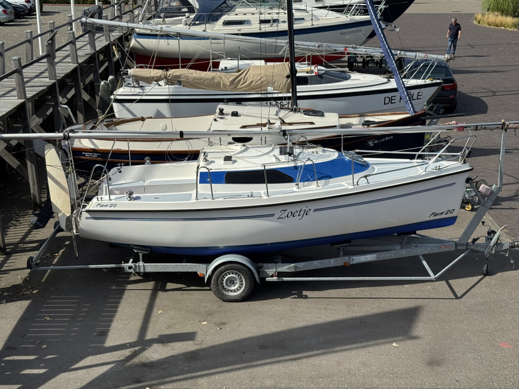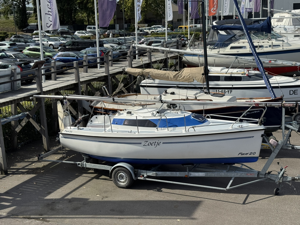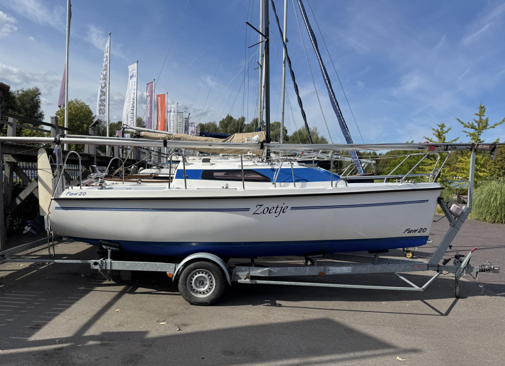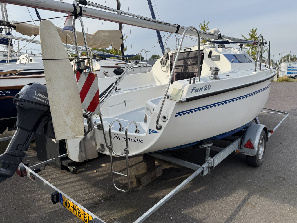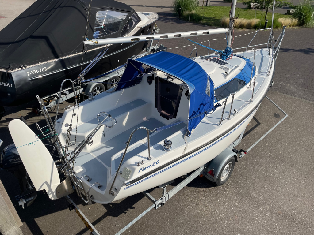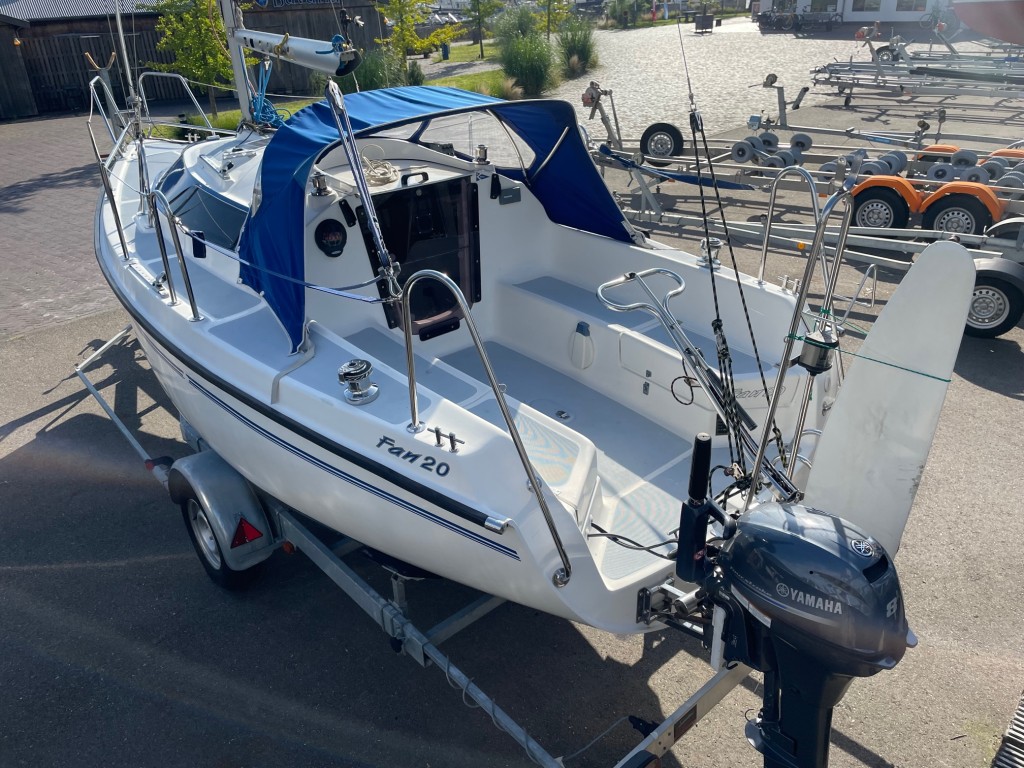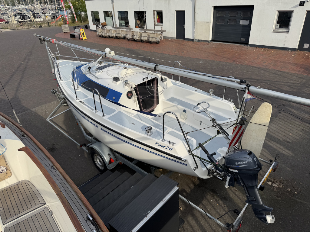Net, sportief en trailerbaar zeiljacht met ophaalbare kiel (diepgang 0.25 - 1.30 m.). Nieuw geleverd aan Nederlandse eigenaar in april 2007. Nette weg-trailer (NL kenteken) en krachtige Yamaha 8 pk 4-takt (2014) elektr. start en motor-afstandsbediening. Motor, acculader en zonnepaneel laden de accu's. RVS maststrijk-installatie. Ideaal voor ondiepe maar ook grotere wateren. Eenvoudig te strijken en te traileren. U kunt eenvoudig droog-vallen met deze zeilboot. Verder heeft de Fan 20, grootzeil met lazy-jack, nieuwe rolgenua met UV-band(2024), zonnepaneel, walstroom, recente service accu, acculader, 220V en 12V aansluitingen, nieuw LED verlichting in kajuit, bedieningspaneel / dashboard, schot-kompas, dieptemeter, snelheidsmeter, stuurautomaat, navigatie verlichting, 4 slaapplaatsen, gootsteen met stromend water, ruime zelflozende kuip, kuip-kussens, 4x Andersen lieren, buiskap, ankerluik met anker, zwemtrap, enz. Aankoop factuur(2007) met CE-document en handboek zijn aanwezig. Ook aankoop trailer en motor(2014) zijn aanwezig. Facturen van onderhoud zijn aanwezig. Te bezichtigen bij Wehmeyer te Naarden.
