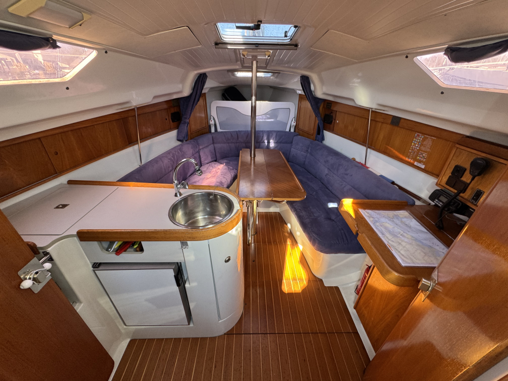teak op kuipbanken, wegneembare kuiptafel + kleine borreltafel, patrijspoort in achterkajuit aan kuip zijde, twee zitjes in de hek-railing. Extra buitenboord-motorsteun.  De batterijmonitor is een Victron BMV-712 Smart. Het zonnepaneel is Faraday Glass 120Wp monokristallijn. De laadregelaar is Victron SmartSolar MPPT 75/10 + bluetooth.