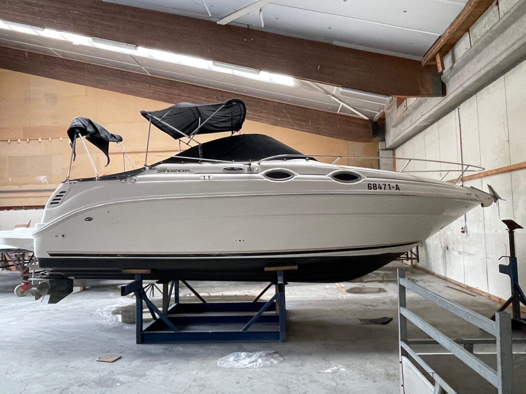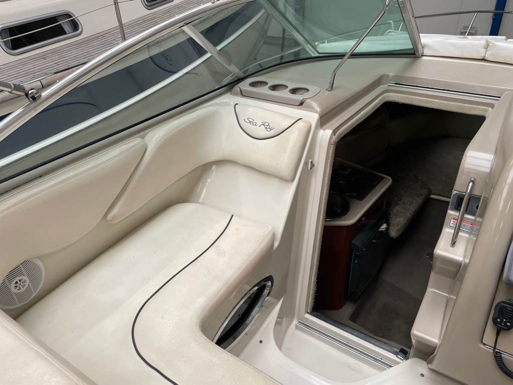 Sea Ray 240 Sundancer met Mercruiser 5.0 MPI 260 pk. Complete speed-cruiser met o.a. groot zwemplateau met geïntegreerd zwemtrap en walstroom-kabel, ruime kuip met bimini-top, kuiptent, buisk