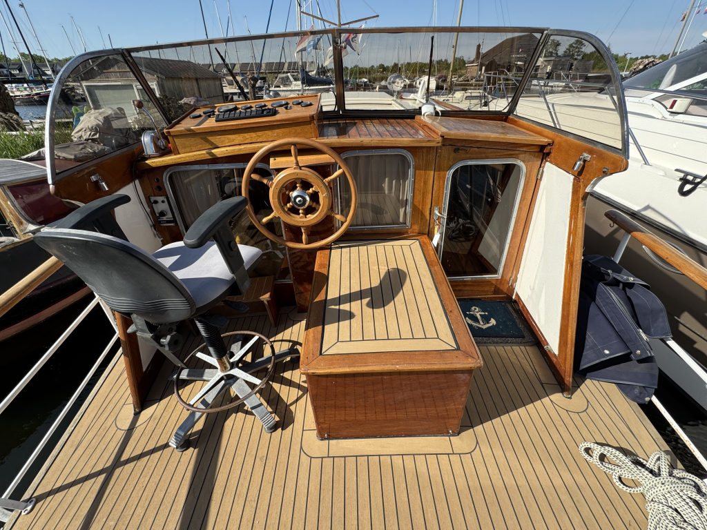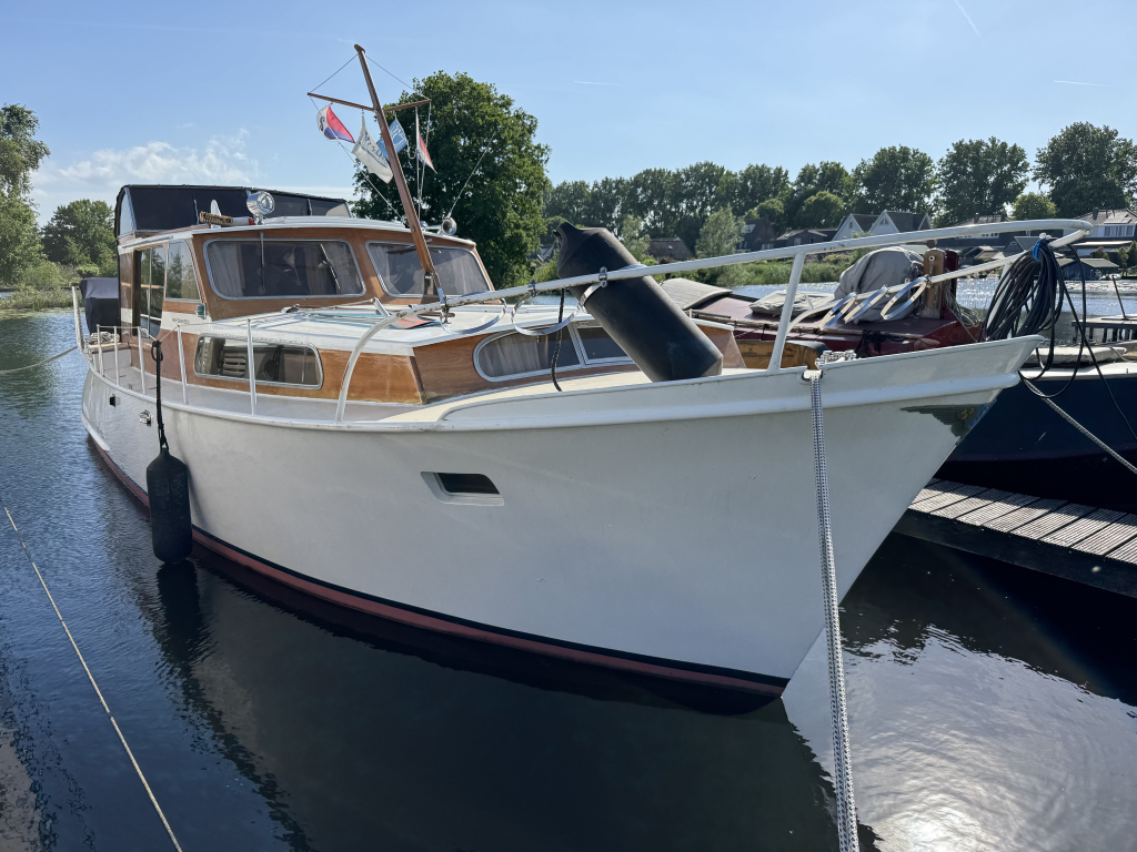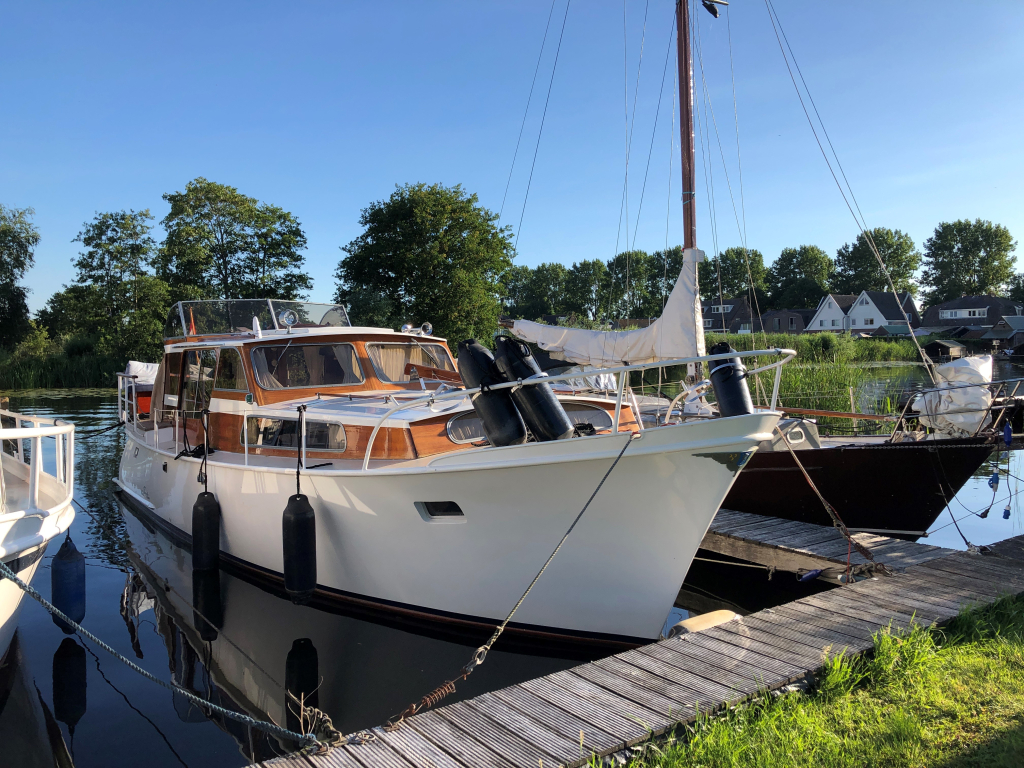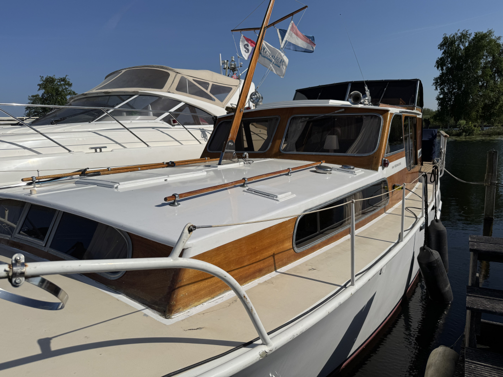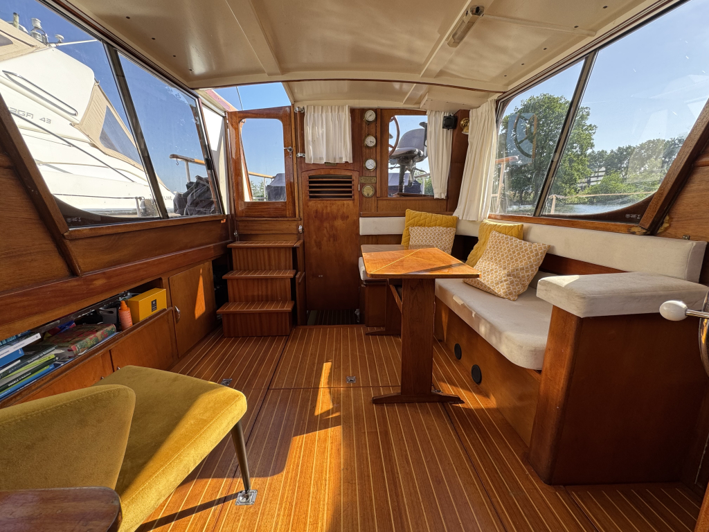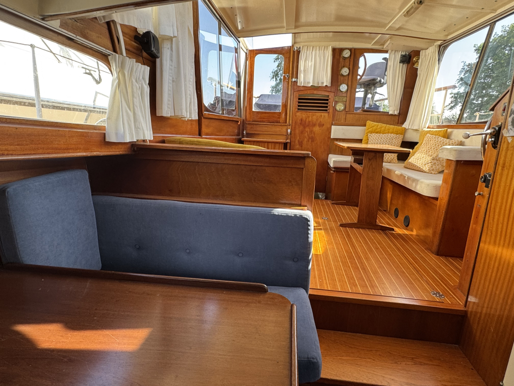 Klassiek motorjacht van Mulder Jachtbouw. De Super Favorite 1100 Deluxe is een frisse gezellige boot met 6 slaapplaatsen, teak vloerdelen in de kajuit, recente kussens en bekleding, salon met ruime
