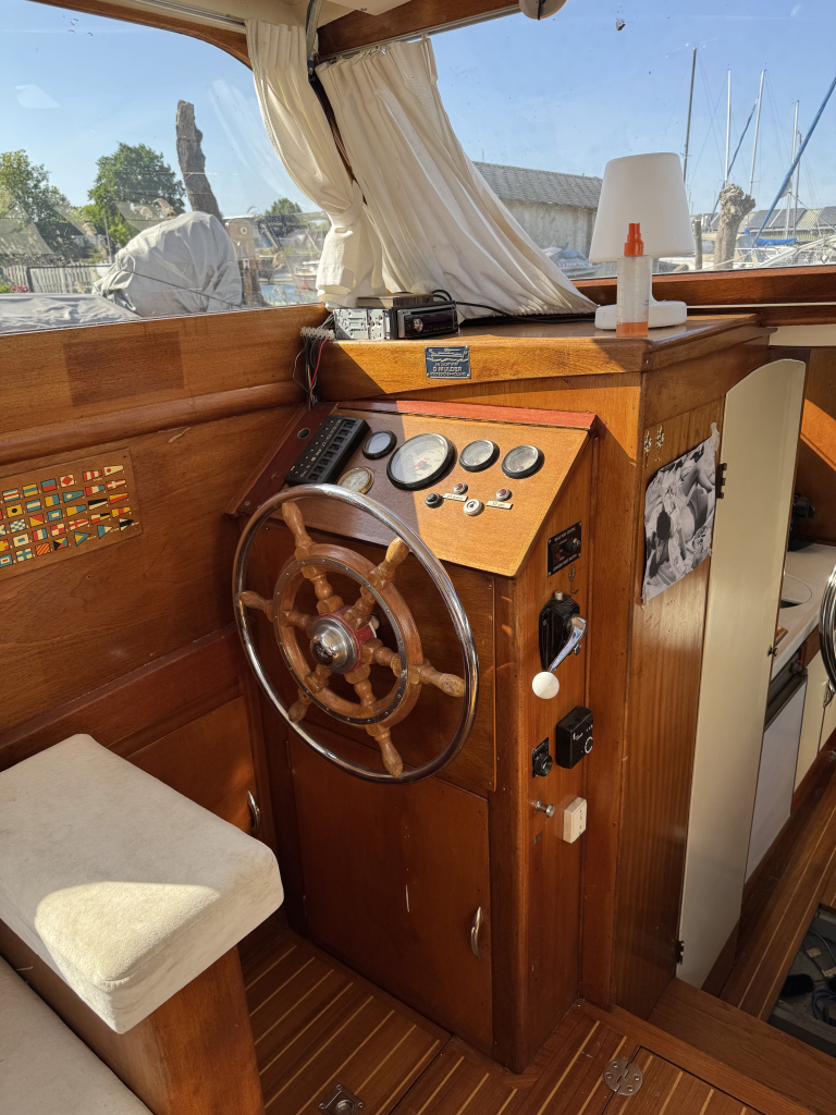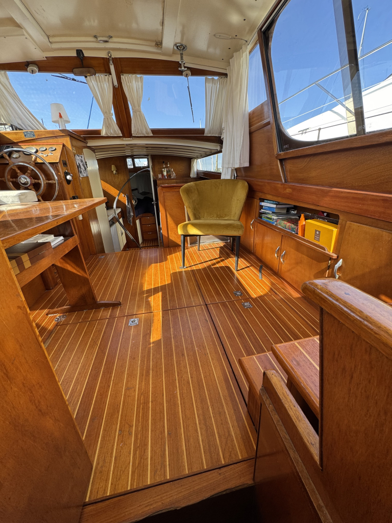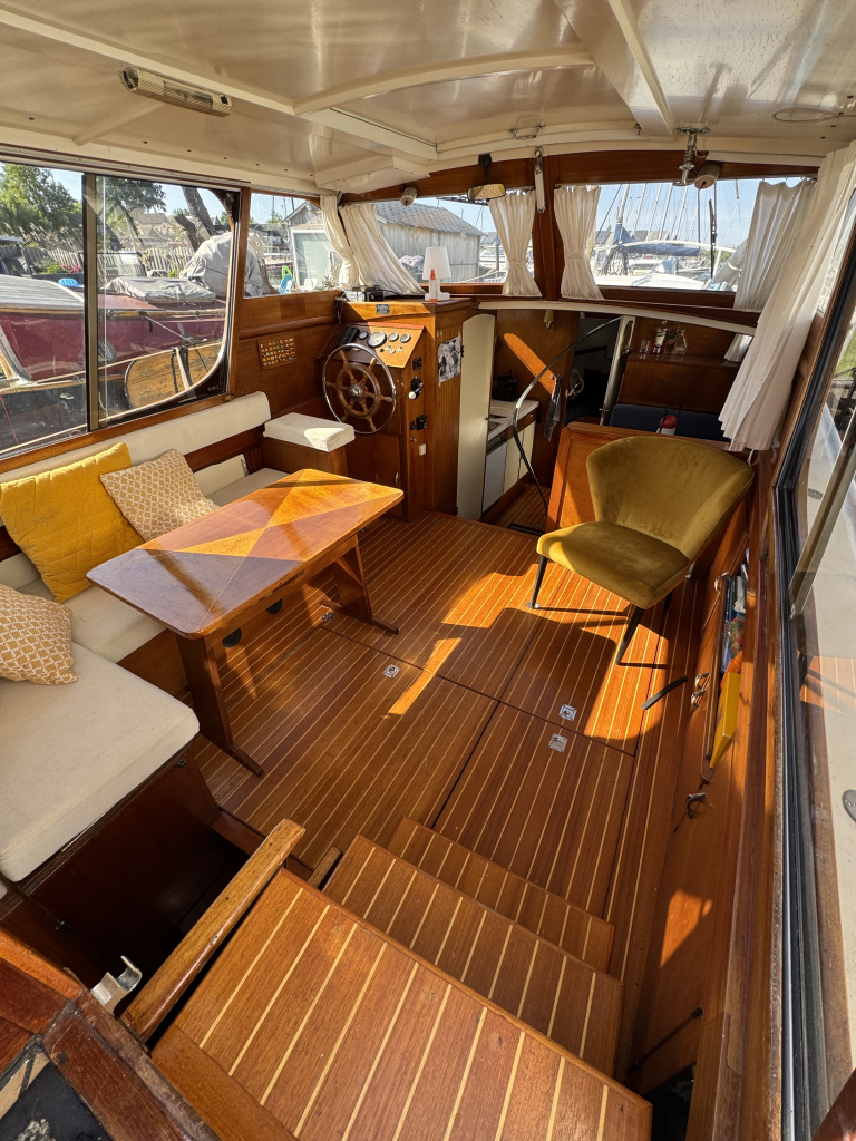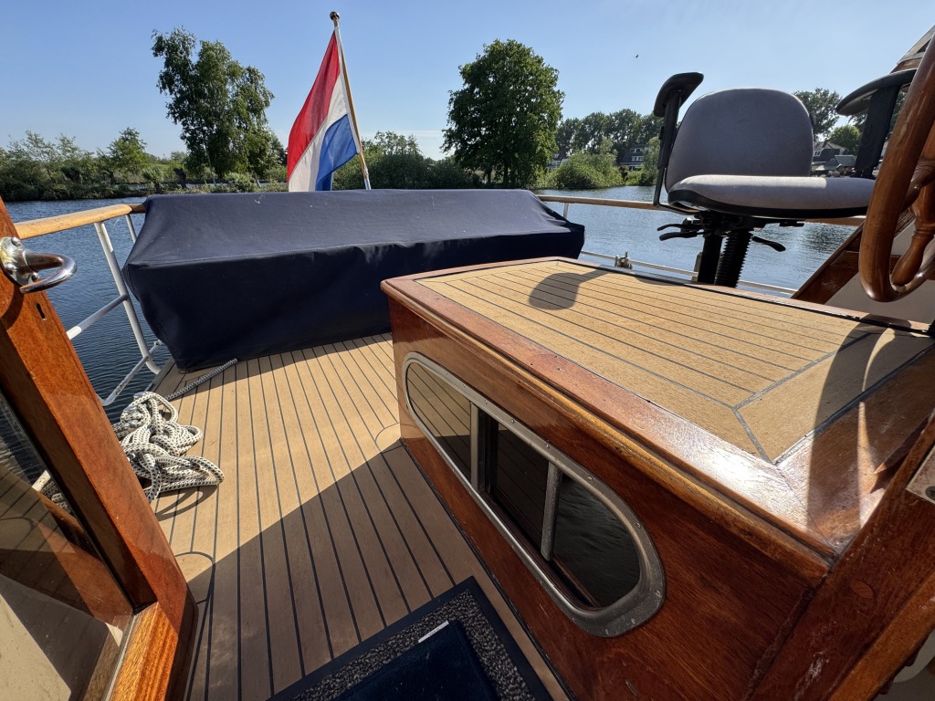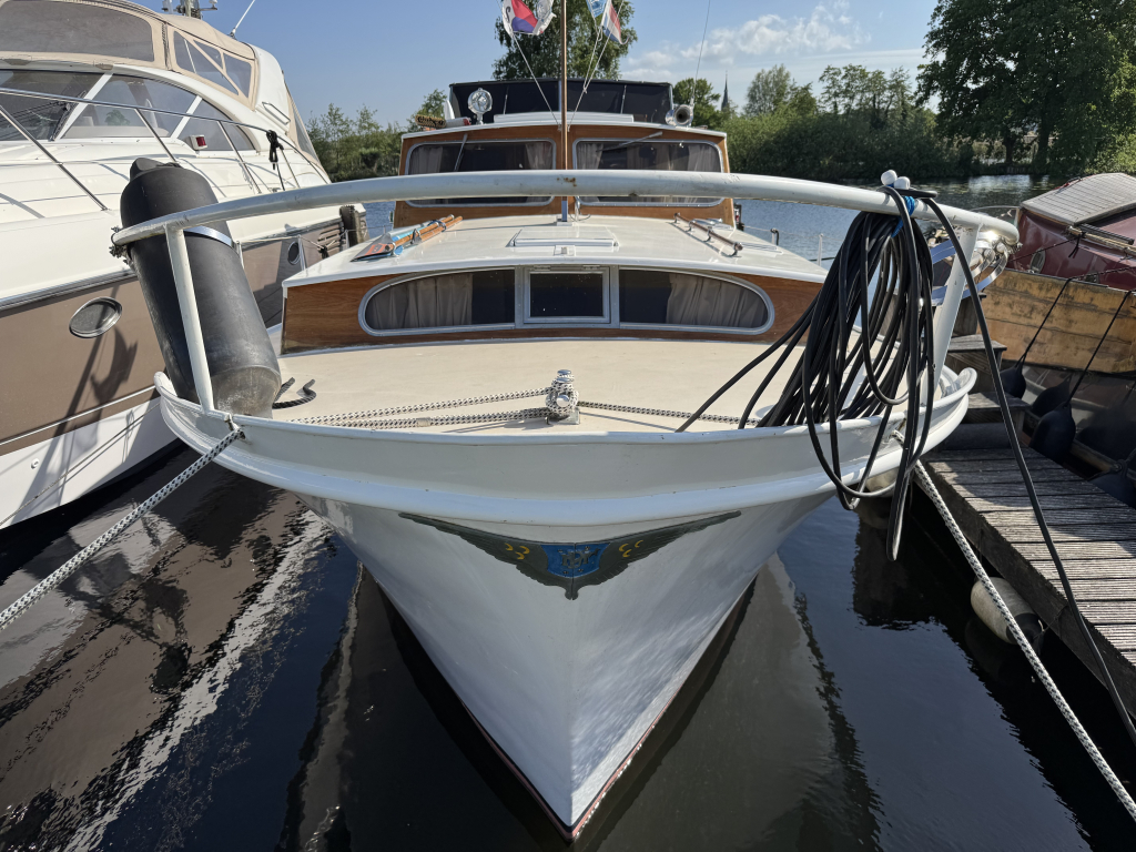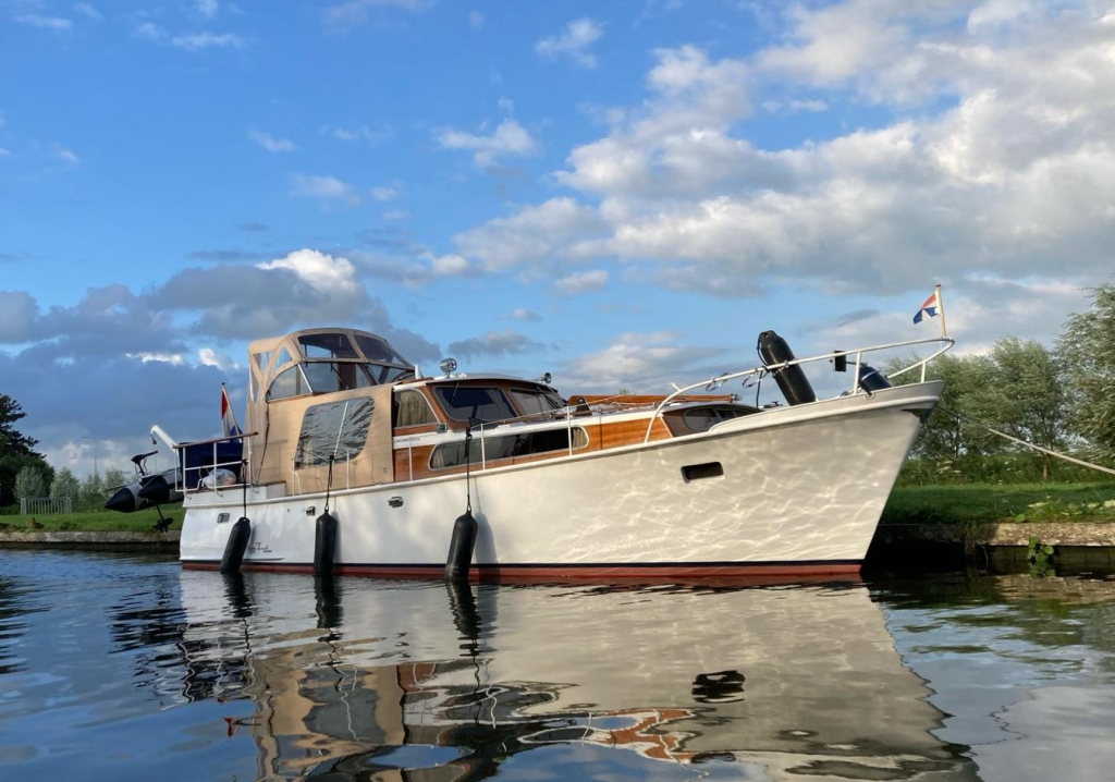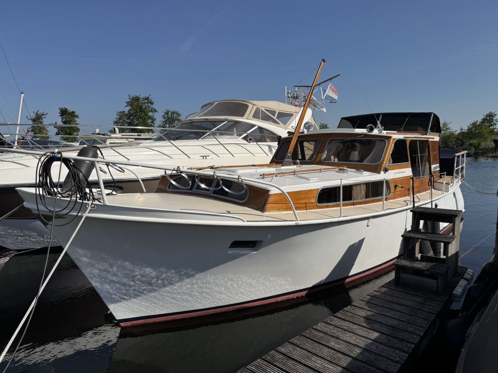 Klassiek motorjacht van Mulder Jachtbouw. De Super Favorite 1100 Deluxe is een frisse gezellige boot met 6 slaapplaatsen, teak vloerdelen in de kajuit, recente kussens en bekleding, salon met ruime
