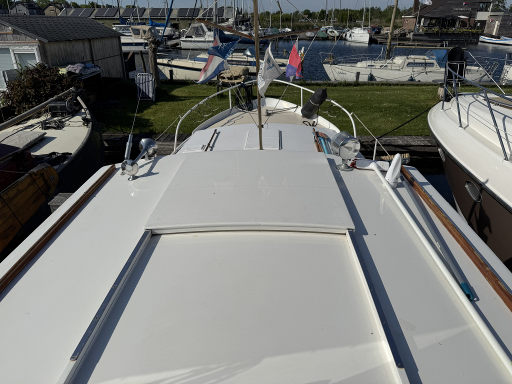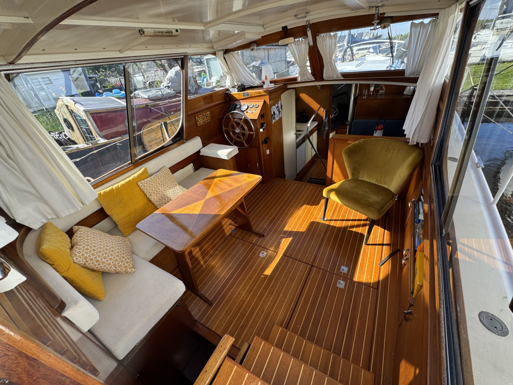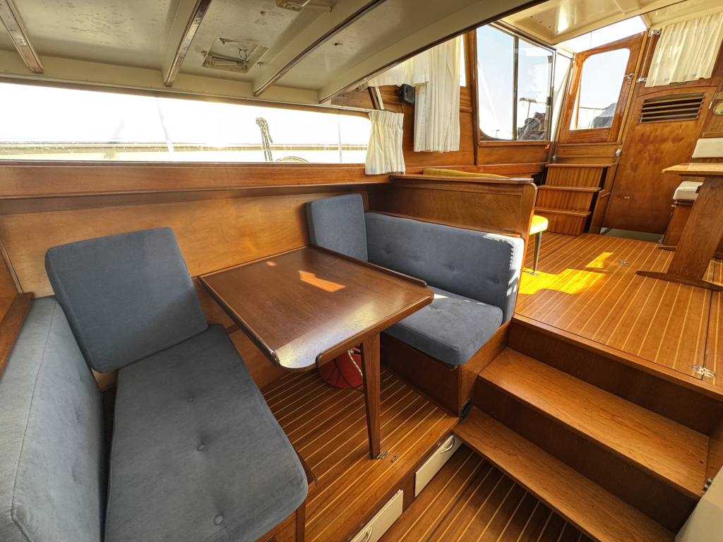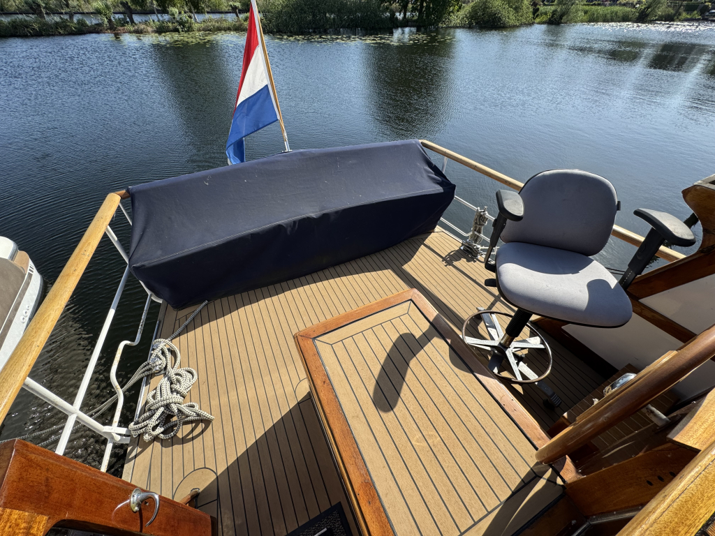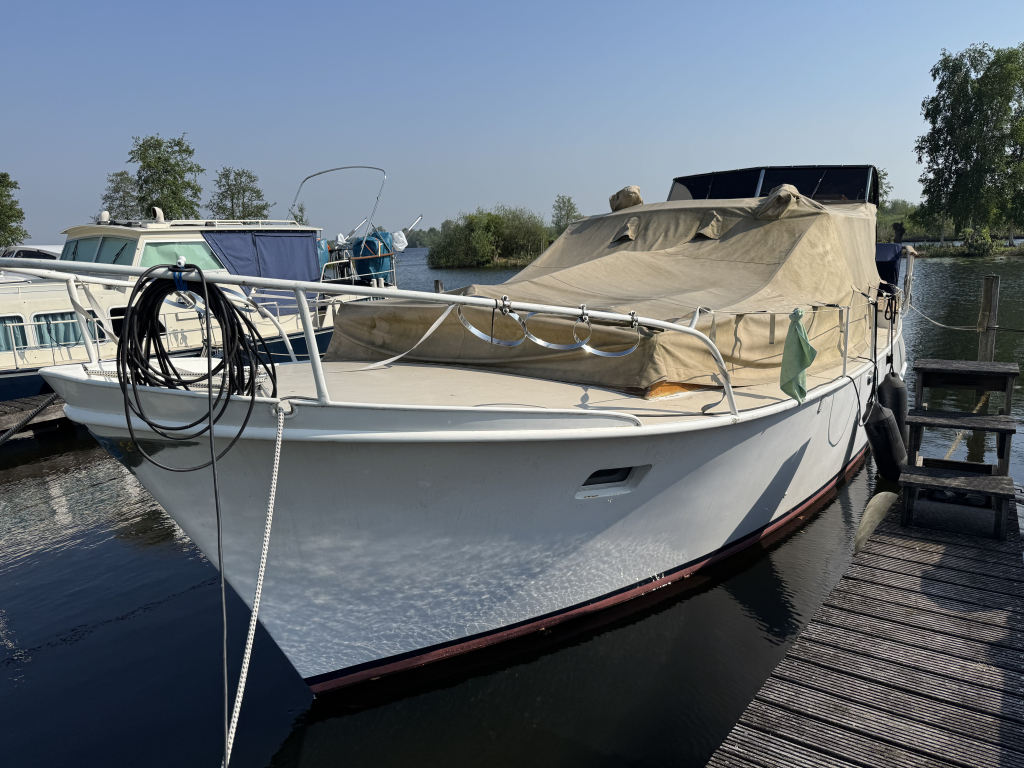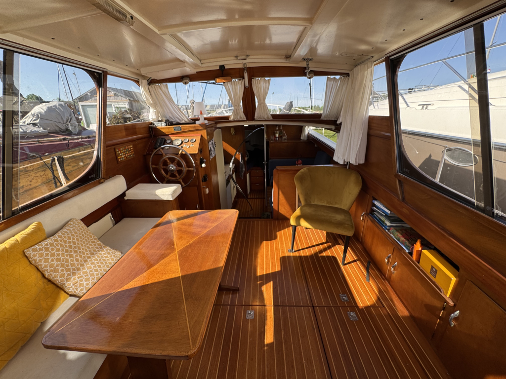 Klassiek motorjacht van Mulder Jachtbouw. De Super Favorite 1100 Deluxe is een frisse gezellige boot met 6 slaapplaatsen, teak vloerdelen in de kajuit, recente kussens en bekleding, salon met ruime